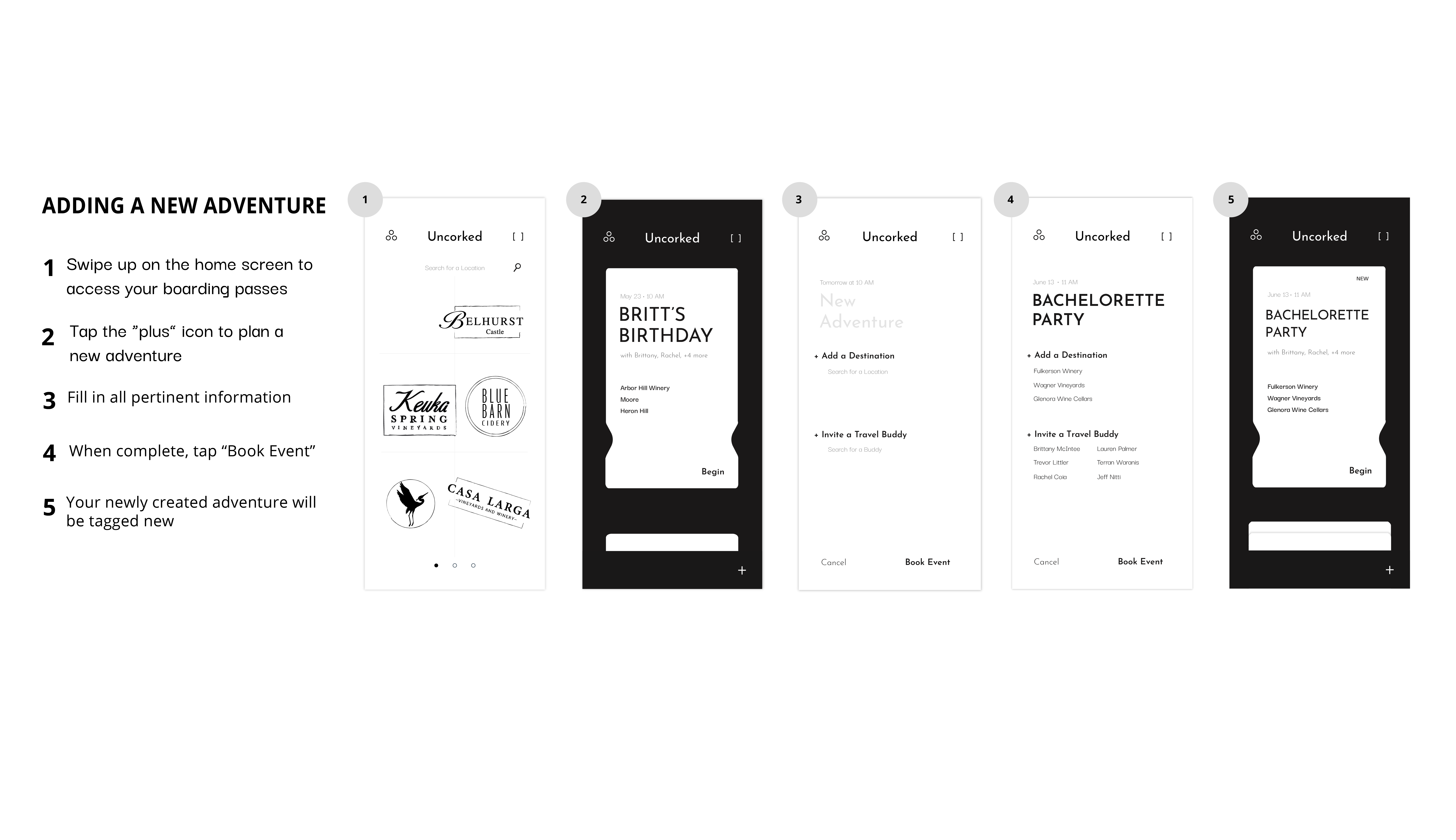 Is it your first time in Uncorked? Ours too! You'll be greeted with an active bar at the bottom of your screen. Swipe up to view your boarding passes, and swipe sift through each of your scheduled adventures!